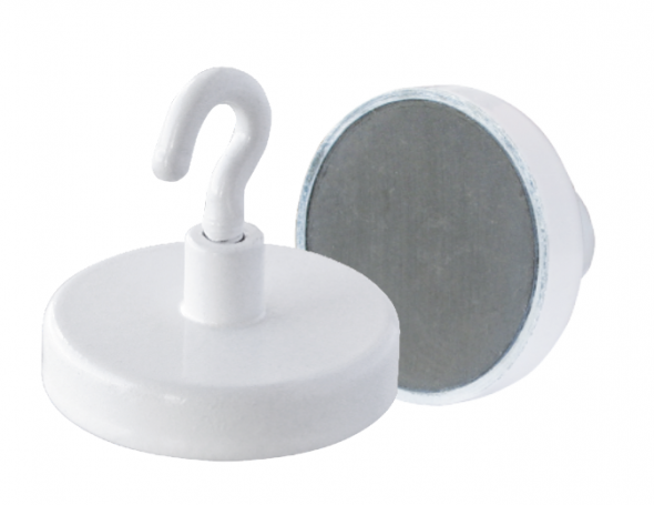The pot magnets with a hook are sometimes called ceiling magnets. The pot magnets with a hook are white painted and are supplied with a detachable threaded hook. The ferrite pot magnets with a hook have a maximum operating temperature of +120 degrees C. The ferrite pot magnets with a hook are cost effective magnets. The pot magnets with a hook are widely used for hanging posters, banners and displays in supermarkets, large DIY stores, exhibition areas, car ferries and cruise ships. With a weaker magnetic pull than Neodymium thay are easy to applya and remove.
