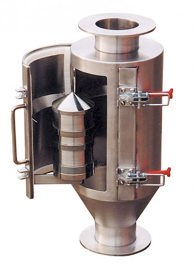 该装置设计用于防止形状大小不一的铁杂质损坏搅拌机、造粒机、混合机、螺杆喂料输送机等昂贵的工艺设备。高强度磁性弹头单元安装在不锈钢外壳的中央。这种设计是为了确保磁性单元不影响产品流动。