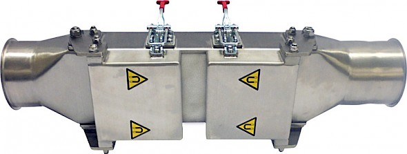 高强度吸底式磁铁设计用于严峻的工况,可清除尺寸较大的螺母、螺栓等污染物。该装置有两个磁极,可产生高强度磁场。该装置通过铰链固定在斜槽上,配有肘节夹确保生产的压力均匀地分布在密封周围,以防止产品泄漏。